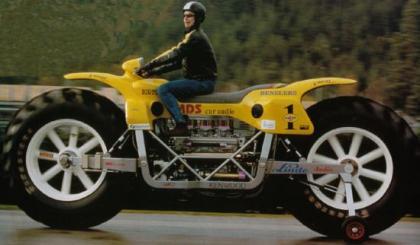 Una moto de 5 metros de largo y más de 2 metros de altura no puede pasar desapercibida. Su peso tampoco está nada mal: 1.645 kg. Y con estas cifras, os preguntaréis qué narices de motor mueve a este bicho. Pues un 12 cilindros de 5,3 litros, procedente de un Vintage Type E Jaguar del 1975, que da unos 300 caballos. Aunque bueno, con el peso de la moto, las prestaciones no deben ser para tirar cohetes. Desde luego, una potencia específica de 0,18 caballos por kg es tirando a tristecillo. Ahora, las ruedecitas de apoyo en la rueda de atrás tienen guasa... 6 años para crear esta moto. Cuesta 80.000 dólares. Está en el libro Guiness. Pero... qué queréis que os diga.