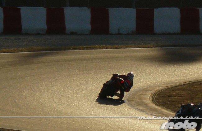 Así que salimos a pista cada uno en su respectiva tanda y vamos a buscar ya un tiempo decente, que nos permita salir un poco más adelantados para no quedarnos en medio del pelotón de gente en el momento de la salida ya que es un momento peligroso de la carrera que es mejor evitar. A esa hora el asfalto está ardiendo y la temperatura en él es de más de 40 grados. En el ambiente el aire que se respira es muy caliente y pierdes una gran cantidad de agua en forma de sudor solo con ponerte el mono. Suerte de los ventiladores del box para refrigerar la moto que sino lo teníamos claro. Ya en pista la moto se mueve mucho, los neumáticos están muy calientes e incluso demasiado, con lo que hay que ajustar bien las presiones para no malgastar el neumático y que no dé problemas al final de la tanda. Una vez terminado el tiempo entramos en box y salen los demás pilotos del equipo.