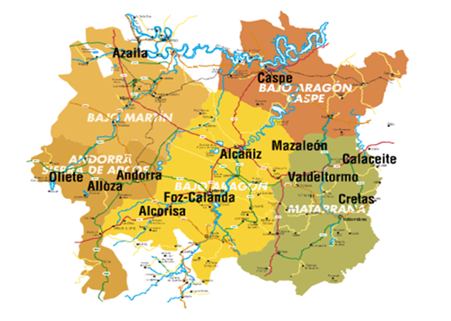 Alcorisa, Alloza, Andorra, Azaila centro de visitantes, Azaila yacimiento Cabezo de Alcalá, Calaceite, Caspe, Cretas, Mazaleón, Oliete, Valdeltormo.