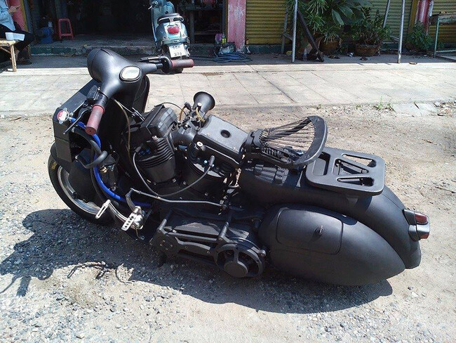 El motor no es de Harley-Davidson, aunque lo parezca. Está basado en su diseño, y se llama '222 Tailandia', modificado por la empresa australiana 'Hy Performance Cycles'. Y eso, enclaustrado en un pequeño scooter de los años '40. Entre sus cualidades, refrigeración líquida, culatas, sincronización de válvulas más alta y relación de compresión de 12,5:1.