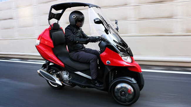Además, viene con transmisión automática y se puede llevar con el carnet de coche (de momento). No es relativamente grande, concretamente 10 centímetros más largo que un Piaggio MP3 300, y tiene una suspensión de doble horquilla para las dos ruedas frontales, con una inclinación máxima de 40 grados.