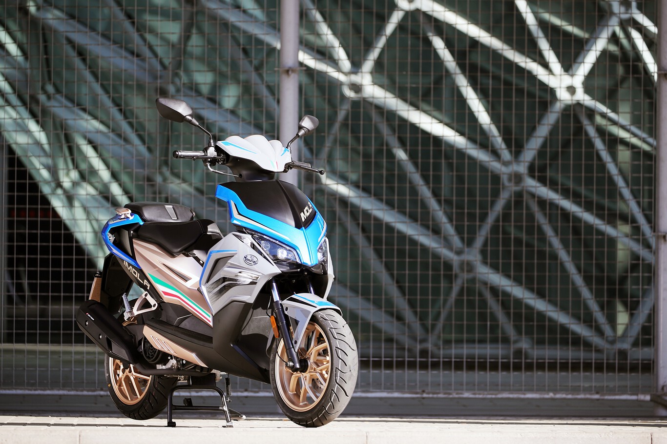 Este historial de grandes premios logrados en ese circuito ha servido de inspiración para crear el nuevo scooter de la marca. Un modelo que llega para competir en el mercado con scooters como el Malaguti Mission 125, con una estética de líneas muy afiladas que imponen agresividad a las formas de todo el conjunto, sobre todo del faro frontal que se divide en dos bloques en la parte inferior del escudo frontal dejando el manillar libre de luces, y que esta conformado por un conjunto de cuatro ópticas polielipsoidales iluminadas por módulos LED de alta intensidad