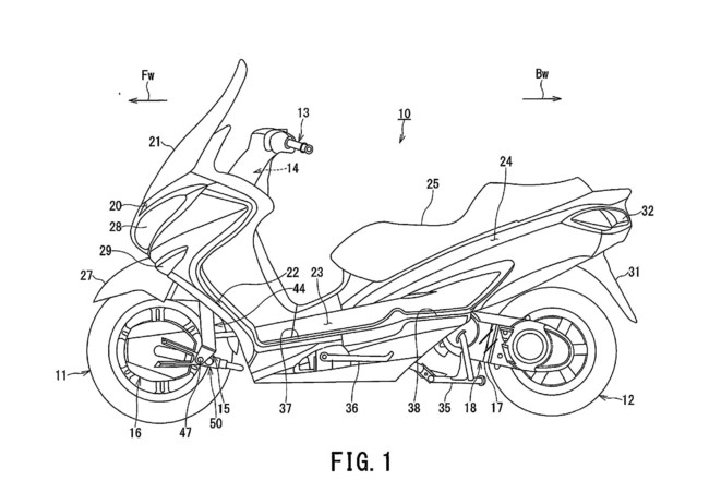 Esta filtración tendría origen en la Oficina de Patentes de Estados Unidos y tal como podemos ver en los esquemas se trataría de una especie de Burgman con tracción a las dos ruedas mediante el empleo de dos motores eléctricos complementarios al motor de combustión y un esquema de suspensión delantero alternativo.
