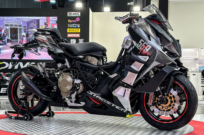 A pesar de ser un scooter, viene con embrague para gozar como si de una moto se tratase. Cuenta con una transmisión de seis relaciones que se completa con un embrague en baño de aceite de múltiples discos, algo relativamente novedoso. Bajo el asiento podemos ver el doble escape de inspiración en superbikes.