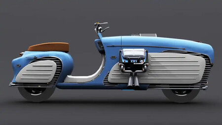 Realmente está inspirada en la forma clásicas de las Vespa y Lambretta, pero con su particular (muy particular) estilo que mezcla coches y motos clásicos. También el motor, un V4 diésel de 1.200 cc y unos pocos ambiciosos 50 CV de potencia que hacen el invento aún más surrealista.