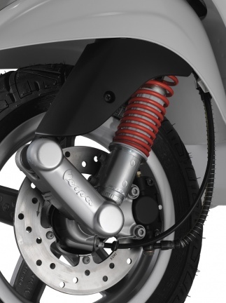 El frontal se ha estilizado y se ha sustituido la guantera tras el escudo por un par de departamentos abiertos que aligeran la figura. También destaca en el escudo frontal la toma de aire en la zona central. La suspensión delantera opta por el archiconocido sistema de brazo articulado y amortiguador, junto con un disco de freno de 200 mm de diámetro mordido por una pinza de dos pistones y un neumático de 11 pulgadas. También destaca en la parte delantera la forma del guarda barros, recortado para ofrecer un aspecto más racing.