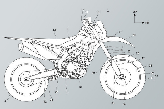 En la patente US 2019/0283835 A1 que Honda ha registrado se ve cómo en una CRF450R hay instalado un sensor en la suspensión que tiene como misión 'leer' el camino por el que va a pasar la moto.