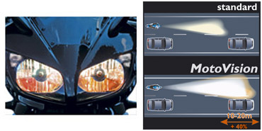 Me parece muy interesante la innovación de colorear levemente la luz de las motos para distinguirlas de los coches. Desconozco si la elección del color naranja es por algún motivo técnico o porque era el color que le gustaba al que diseñó la bombilla. Al menos me tranquilizo que no se trata del color corporativo del fabricante.