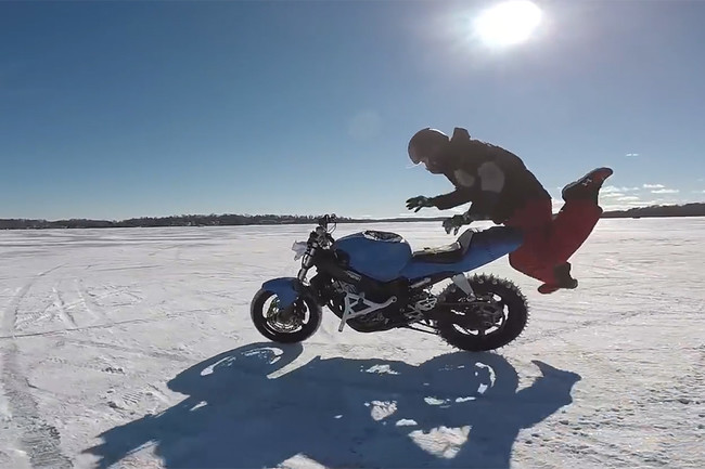 Después de intentar subirse a la moto en marcha, el piloto del video pierde el equilibrio y se va al suelo. Ese es el instante en el que empieza la odisea de hacerse con el control de una moto que cabalga sola y no precisamente al estilo del Yamaha Motobot. Y también es el momento en el que los protagonistas del video se dan cuenta de que tirar una moto en marcha sobre una laguna helada no es una tarea nada fácil.