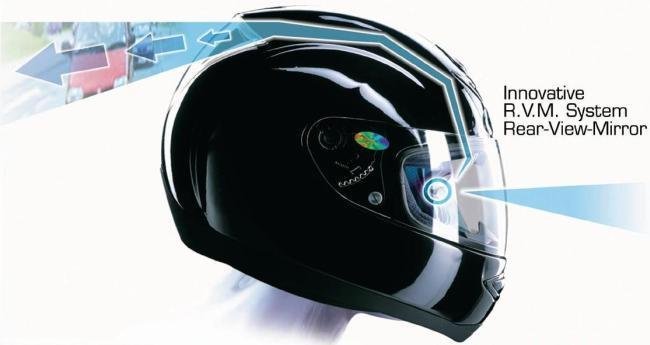 Este sistema retrovisor está formado por varios espejos integrados en la calota del casco. La visión posterior la capta una ventana transparente situada a la altura de nuestra coronilla y llega a un pequeño espejo retrovisor que queda por encima de nuestros ojos. De esta forma, echando un rápido vistazo hacia ese retrovisor veremos que sucede a nuestras espaldas.