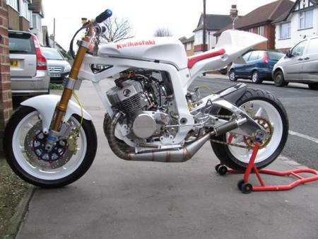 Todos sabemos que en Inglaterra hay grandísima devoción a las motocicletas pese a su húmedo tiempo, también somos conscientes de que son los más atrevidos y osados para liarse la manta a la cabeza y deconstruir sus monturas para modificarlas, pero lo que os traigo hoy es muy rebuscado. No me preguntéis cómo, pero al señor Cabbie, de Custom Fighters, le dio por crear esta Kwikasfaki GSX-R 400 prácticamente de la nada uniendo un chasis de GSX-R 400, un motor Kawasaki de drag bike y unas tijas descomunales.