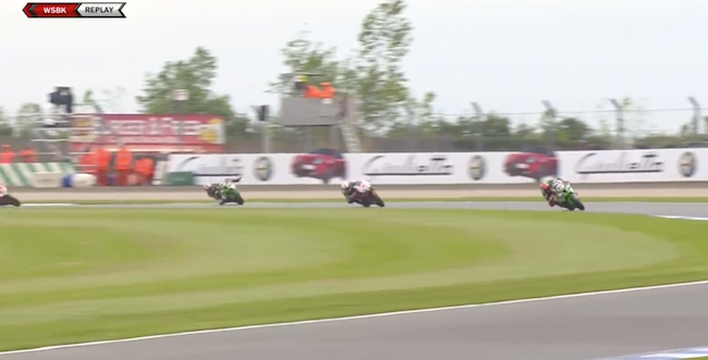 Pongámoslo en contexto: se acaba de apagar el semáforo, Leon Haslam le ha ganado la posición a Jonathan Rea por fuera y se dirigen a completar la primera vuelta, aun sin llevar los neumáticos en sus mejores condiciones de temperatura. Sykes ya le ha ganado el primer duelo después de haber dejado claro que haría lo que fuera por llevarse la victoria. Con esa "presión" sobre sus hombros, Rea salía dispuesto a disputar la victoria con un Sykes algo más calmado. Pero en cuanto la goma trasera de la Ninja ZX-10R empezó a deslizar, tuvo que cambiar de planes.