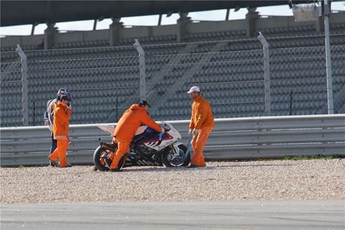 Como ya comentamos el viernes, el equipo BMW Motorrad tiene bastante trabajo por delante, y quizá muestra de ello sea esta caída, en la que el piloto intenta ir un poco más allá de las prestaciones de la moto pero esta no es capaz de seguir al propio piloto. El resultado es esta espeluznante serie de fotografías con Rubén Xaus dando volteretas por la grava del circuito portugués.