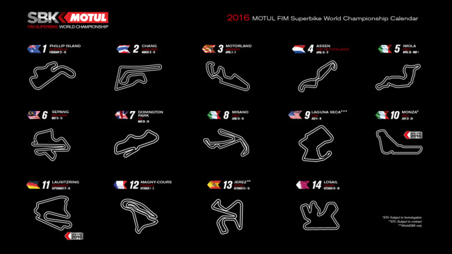 Ya se ha publicado el calendario provisional del Mundial de Superbikes 2016, y en el encontramos algunos detalles que llaman la atención. El primero es la desaparición de la cerrera de Portimao (Portugal) parece que los organizadores han decidido que dos carreras en tan cercanas en la península no eran rentables, y ha acabado prevaleciendo la de Jerez. Aunque esta última está sujeta a que se cumpla el contrato.