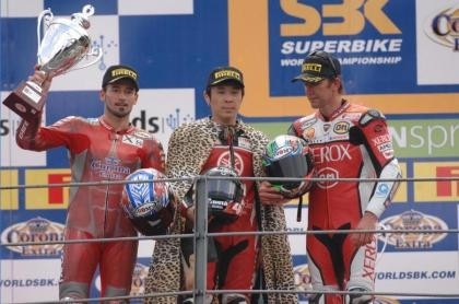 Y es que el ritmo que ha marcado Haga en las dos carreras ha sido demoledor, con la única resistencia del equipo Honda Ten Kate durante la primera manga hasta que las gomas de James Toseland le hicieron ir perdiendo pistonada poco a poco hasta quedarse fuera del cajón. De echo, en la salida de la primera manga, Haga se permitió el lujo de perder hasta seis posiciones. El podium de la primera carrera lo completaron Troy Bayliss y Max Biaggi.