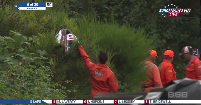 Ayer además de carrera de Superbikes también tocaba ronda del BSB (British Superbikes) en el circuito de Brands Hatch y la primera carrera estuvo marcada por varias caídas durante la misma (por dos veces tuvo que salir el coche de seguridad). Increíblemente y viendo las imagen que podéis ver en portada donde se ve a un comisario retirando el semicarenado superior de un árbol, podrían haberse hecho mucho daño.