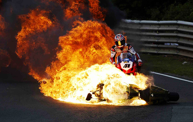 Creo que he perdido la cuenta de las veces que me he encontrado una misma foto repetida una y otra vez entre las instantáneas más impactantes del motociclismo. En foros, revistas, blogs etc… pero en muchos casos la historia que tienen detrás queda en segundo plano. Hoy – preparando algunas cosillas que saldrán pronto – me he topado con una de ellas y me gustaría darme el gusto de contar el qué, cuándo y cómo pasó de esa foto en la que Noriyuki Haga se ve envuelto en llamas.