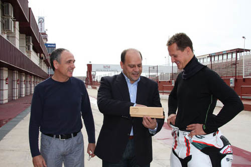 Michael Schumacher se acercó ayer por Albacete, y no precisamente para comprar una navaja típica de la zona. Ya se la regaló el director del Circuito, Andrés Sánchez Marín para que se fuese con un buen recuerdo. Pero no fue este el único recuerdo que se debió llevar Schumacher de su paso por Albacete, ya que el alemán estuvo rodando con la BMW S1000RR.