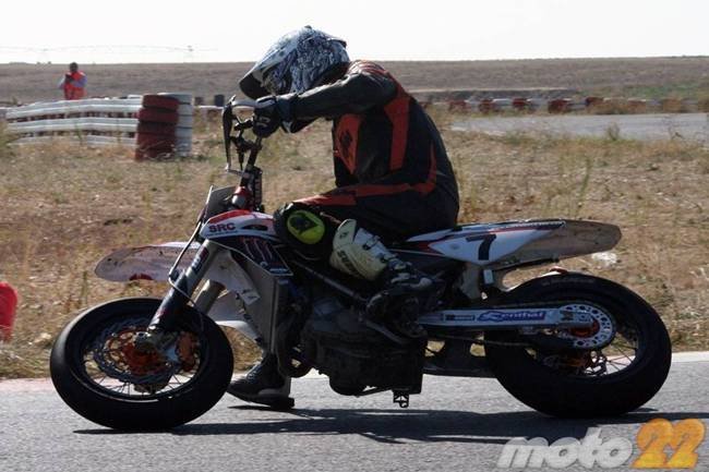 A medida que van pasando las vueltas voy cogiendo confianza y comienzo a rodar en los mismos tiempos que con la KTM, algo lento en comparación con los que he marcado en otros entrenamientos en ese circuito pero bastante decentes para ir con moto ajena y con tan sólo cuatro grados al comienzo de la mañana. La puesta a punto de BMW G450 X Supermotard busca un buen compromiso entre la conducción más off-road con la pierna fuera y la de más estilo velocidad con la rodilla. Diego Grande utiliza indistintamente una y otra en función de la curva y del circuito por lo que necesita una moto bastante neutra en ese sentido.
