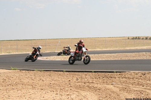Al poco de salir a caminar allí llegó Grillo, con lo que de momento, sólo éramos dos supermotard. Con ese número de inscritos ni correríamos ni nada, por lo que me pegaría 630 kilómetros para ver, como mucho, girasoles. Por suerte, un poco más tarde llegó un chico nuevo con el que no había coincidido, Jorge, que era de Valladolid. Menos mal, sólo eramos tres pero por lo menos podríamos correr y, sobre todo, hacer que la carrera fuese puntuable. Es un poco decepcionante encontrarse en un buen circuito, con un buen día, y que el número de participantes sea tan bajo, pero poco se puede hacer. Bueno si, lo menos que podía hacer era pódium, jejejejeje.