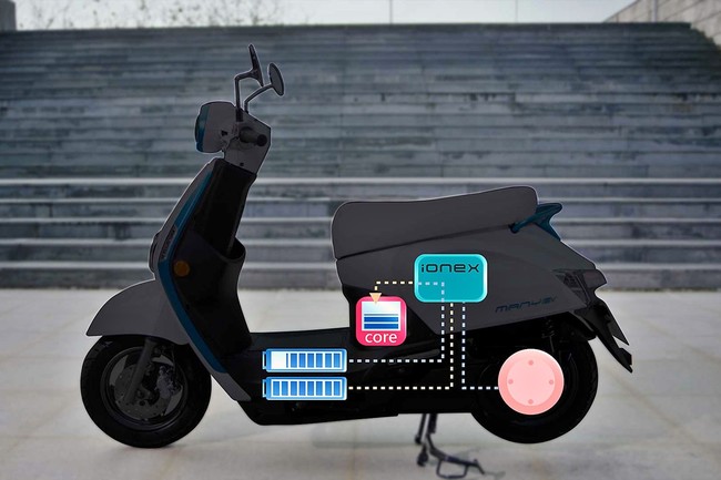 El proyecto se llama Ionex y consiste en un despliegue de baterías extraibles, con paquees de 5 kg de peso cada uno que se instalan de manera sencilla en el suelo de sus scooter eléctricos. Según el prototipo que ha servido de modelo, el ManyEV, el sistema cuenta con dos baterías colocadas bajo el suelo plano que podremos sacar con sólo pulsar un botón o recargarlas directamente conectando el scooter a la red eléctrica.