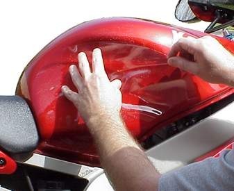 Los hay de dos tipos, uno, de 3M, que va con adhesivo, más difícil de poner pero más resistente y otro, el "Tankslapper" que se fija con agua, es más adaptable y se puede poner y quitar tantas veces como quieras. Hay kits para proteger toda la moto, que mezclan los dos tipos de lámina según la zona a tratar, por unos 40 euros. Si has pintado algo a mediad en tu moto, esto es una buena idea para protegerlo, merece la pena.