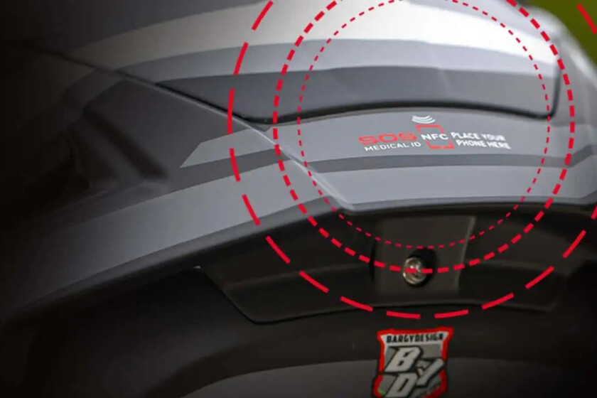 Su sistema SOS Medical ID se basa en algo tan simple como un chip NFC integrado en la parte trasera del casco, acompañado de un gráfico visible que avisa a los servicios de emergencia de que ahí hay datos importantes esperando ser leídos.