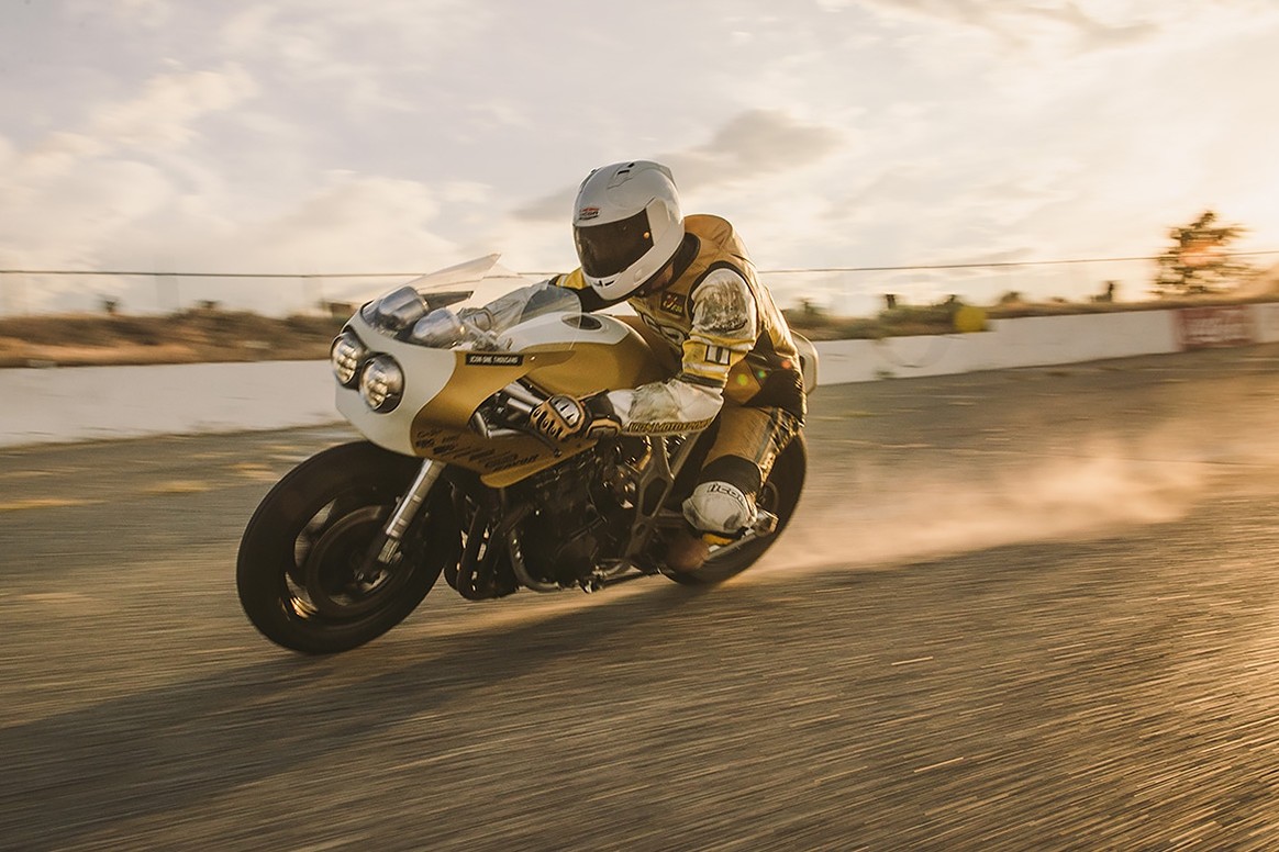 La Coronel Butterscotch, una máquina que parte de una Suzuki Bandit 1200 de hace 20 años, fue construida para correr y para disfrutar de la carretera. Sin embargo, nada más duro que la propia realidad (y el asfalto). Recién salida del garaje de Icon 1000 el piloto tuvo un accidente. No frenó a tiempo y la moto cayó al suelo y derrapó durante unos cuantos metros.