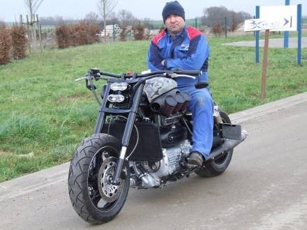 Aquí está el orgulloso propietario de esta Triumph Rocket III preparada, perdón, tuneada, un bicho de 2300cc, que da 220 CV de potencia y que además tiene un kit N.O.S. Vamos, menudo pedazo de pepino, y menuda botellica de nitro que lleva acoplado a la trasera (como veréis más abajo).