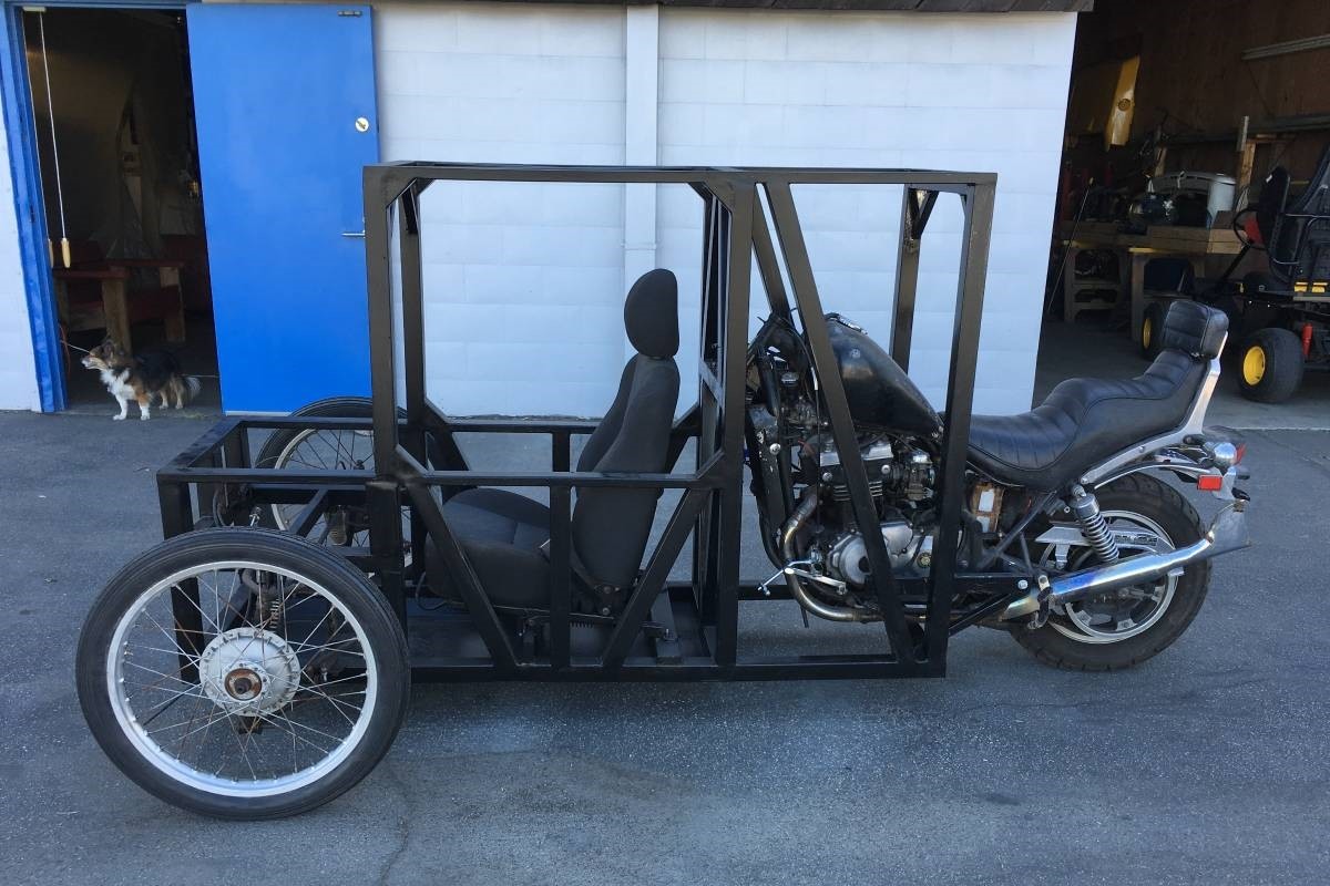 El creador de este triciclo tan bizarro se llama Rich y ha utilizado una Kawasaki 454 LTD de 1985 como la del vídeo para su creación final. Le ha quitado la dirección y la ha unido a través de una estructura metálica a un asiento con cinturón. Con ese cambio, la dirección se controla gracias a un volante.