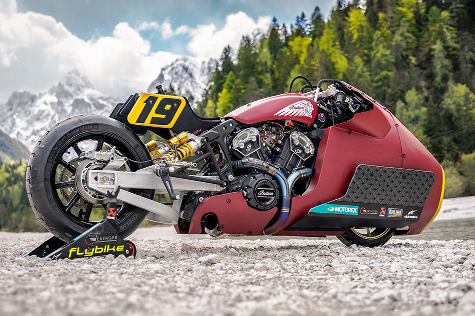 Esta moto tan peculiar está construida con el motor de 1.250 centímetros cúbicos de la Indian Scout. Aunque no se ha modificado nada del corazón de la máquina, sí que se ha aumentado su potencia hasta los 130 CV gracias a elementos como una ECU de competición, una admisión directa, un power commander, un sistema de inyección de óxido nitroso y un sistema de escape de titanio firmado por Akrapovič que hace que "el sonido de la moto sea un disparate", según Brice Hennebert.