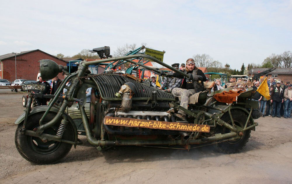 Esta mastodóntica moto está fabricada únicamente con piezas rusas. Y además de 'Catalina la Grande', también se llama 'Panzerbike'. Es tan grande, tan grande, que hacen falta dos conductores. Casi parece un tren con ruedas de excavadora.