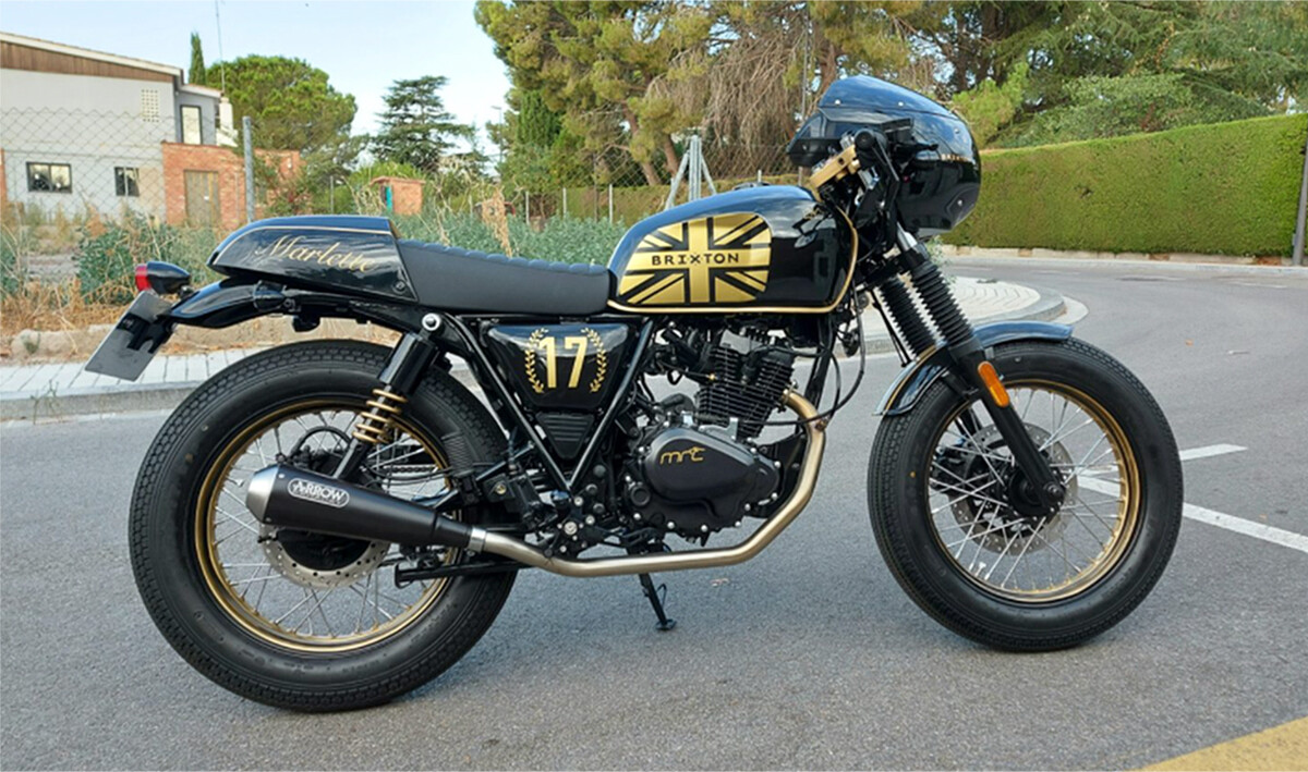 La base utilizada es una Brixton Sunray 125, a la que le ha incorporado una cúpula de la Brixton Haycroft 125 y un depósito inspirado en el del modelo Brixton Felsberg. El silenciador Arrow le pone el toque final a una moto con los colores de aquel Lotus pero que también añade detalles como la inscripción Marlette (en honor a sus hijas Martina y Arlette, desgraciadamente fallecidas) así como el dorsal 17, una cifra muy importante para la familia.