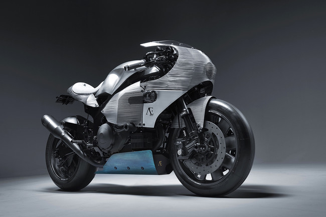 La carrocería se ha modificado totalmente como puedes comprobar a simple vista. Sus influencias clásicas se conjugan con una visión puramente modernista de Praëm y se refleja en un carenado creado a base de 1.150 cables de acero superpuestos con una abertura frontal que toma el aire donde iría el faro. Las piezas donde han utilizado esta técnica (carenado frontal, laterales, colín y guardabarros delantero) pesan 7,8 kg, y los faros de LED se colocan ahora sobre los laterales del carenado.
