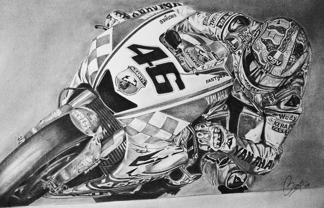 Sin embargo, y aquí se desvía de ese "como muchos", Benjamín ha encontrado un punto en el que sus dos pasiones se tocan para dar fruto a auténticas obras de arte. ¿Por qué no aprovechar sus cualidades con el grafito para inmortalizar el motociclismo que tanto ama? La idea vino cuando conoció el trabajo de Ronnie Cramer y así, con la inspiración recién encontrada, comenzó primero dibujando a algunos amigos, haciendo pequeños encargos. Han pasado diez años y tras una lesión de espalda que le ayudó a recapacitar, ha orientado su tarea hacia los grandes personajes del motociclismo.