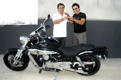 Pues bien, después de recordar algunas de las canciones más destacadas de este DJ español, vamos al grano. Según aparece en la página web de Hyosung en España, Chimo es un fan de la marca y recientemente se ha hecho con una Aquila GV650i Hyperblack. En la foto podemos ver el momento de entrega. Tal vez la use para “irse, irse de bareta con la tia Enriqueta montada en motocicleta”...