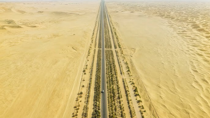 Es la conocida como autopista de Tarim, y es la carretera más larga construida en un desierto. Cruza el desierto de Taklamakán, y aunque suene árabe, se encuentra en el noroeste de China. En mitad de un sistema completamente árido, esta infraestructura está flanqueada por un enorme cinturón verde.
