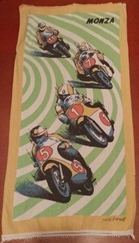 Y que siga al pie del cañón se entiende cuando descubres que hace más de 40 años su toalla de playa era una representación del Circuito de Monza, del Gran Premio de las Naciones de 500 con unos posibles míticos protagonistas a la vista de los cascos: Ginger Molloy en primera posición seguido de Giacomo Agostini, Gyula Marsovszky y Silvano Bertarelli. Y entonces también se entiende el porqué de este bicho que me recorre todo los días el cuerpo. Felicidades y de nuevo gracias.
