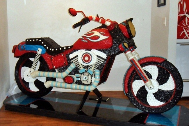Así hasta juntar un total de 20.000 elementos que forman una custom que, potencia no tendrá pero calorías las suficientes para ganar cualquier competición que se precie. El autor, Cristiam Ramos, es un especialista en el trabajo con golosinas ya que realiza retratos de celebridades con la misma técnica.