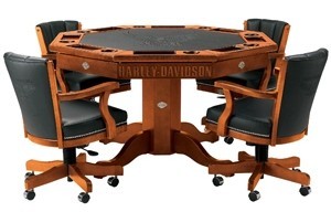 Esta mesa posee una superficie octogonal de 54 pulgadas reversible, que por un lado sirve para comer y por otra para jugar al póker. En el lado para jugar al póker y en el respaldo de las sillas, presenta el logo de Harley con el águila, que también está presente en otras zonas de la mesa en forma de medallones plateados. Eso sí, su precio no es precisamente barato: 3.700 euros.