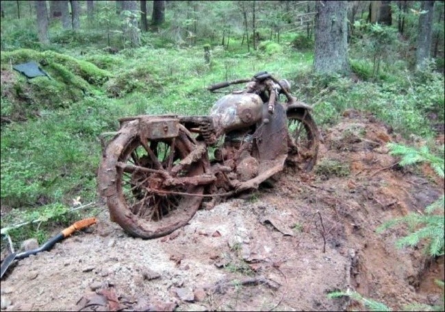 Desde luego no todos los días ocurre que se encuentre enterrada en el bosque una moto de la Segunda Guerra Mundial. Además no hay muchos más datos sobre este hallazgo, ni siquiera donde es el lugar en el que se encontró, o cual es el modelo de la moto. Solo se dispone de la galería de fotos que también os traemos a continuación. Pero examinando más a fondo las fotos yo pienso que se confirma la teoría del montaje.