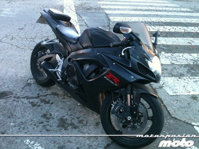 Eso es la teoría sobre el papel. A la práctica, esta Suzuki GSXR 600 esta abandonada a su suerte desde hace dos meses en una plaza cercana al domicilio de quien os escribe estas líneas. Ha helado, llovido y casi hasta granizado encima de ella pero sigue quieta formando parte del mobiliario urbano con la mirada triste y heridas cual guerrero que regresa de una batalla. El colín parece en su sitio pero esta desencajado, faltan los contrapesos de los semi-manillares, partes de su carenado están resquebrajadas y una pegatina en su cúpula delata, como suponíamos, que esta pequeña deportiva ha dado guerra por esos circuitos de Dios.