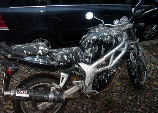 Al contrario de lo que nos pueda parecer lo peor de las "cacas" de pájaro no son los ácidos que contienen. O al menos eso es lo que nos cuentan desde Auto Glym, una empresa que ha sacado al mercado un producto para limpiar las posibles manchas que nos dejen los pájaros en nuestras motos. Según ellos lo que pasa cuando llevamos una de estas en nuestra moto es que la laca y la pintura de alrededor se calienta y dilata de una manera mientras que la parte oculta bajo la mancha no lo hace igual, con lo que se generan unas ondulaciones en la pintura y esta acaba por perder su uniformidad.