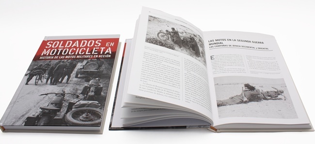 El primero de los dos libros que responde al título Soldados en Motocicleta: Historia de las motos militares en acción tiene un tamaño de 18x24 cm y un total de 244 páginas en encuadernación de cartoné. Utilizando la moto como hilo principal, cuenta la historia que rodearon a las guerras y el periodo de paz entre ellas.