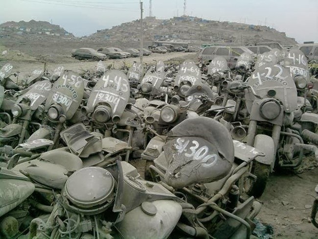 A que lo primero que habéis hecho al ver a foto de portada es echar las manos a la cabeza. Lo sabemos porque nosotros hemos hecho lo mismo. Esta tomada en el depósito de la Policía Nacional de Puente Piedra, al norte de Lima (Perú), antes de que estas motos saliesen a subasta y se desperdigasen por todos aquellos desguaces y compraventa que les dieron posteriormente salida.