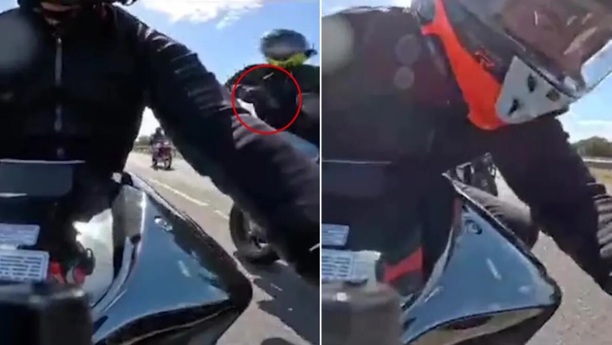 Las motos se ponen a la par del dueño de la Kawasaki, que circulaba a una velocidad de crucero, unos 140 km/h aproximadamente, según el registro que aparece en el propio vídeo. De repente, uno a cada lado, desenfundan las pistolas y no dudan en apuntar al piloto e incluso disparar al aire para hacer que se baje de la moto en plena autovía y robársela.