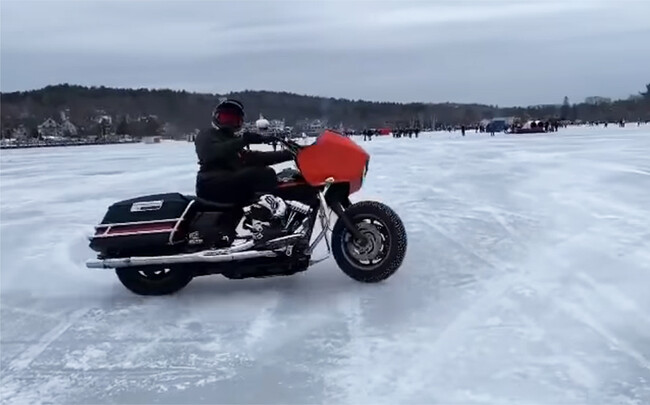 Lo de derrapar y controlar un moto sobre un lago helado no es algo para cualquiera. Hay que tener una gran habilidad con la montura, todavía más si se trata de las Harley-Davidson tan pesadas que vemos en este vídeo.