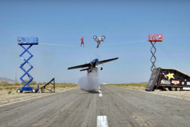 Los dementes encargados de esta bestialidad han sido Melissa Andrzejewski a los mandos de la avioneta, Sketchy Andy Lewis el encargado de caminar sobre la cuerda y Jimmy Fitzpatrick marcándose un vuelo espectacular a los mandos (o sin estar a los mandos en realidad) de su Honda CRF 450R.