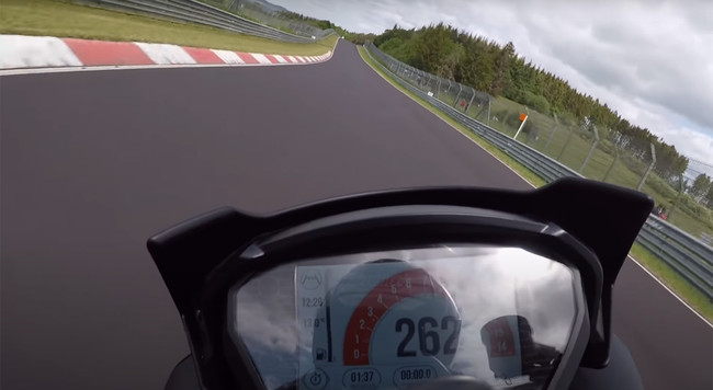 La Triumph que conduce incorpora el motor de tres cilindros en paralelo con un cubicaje de 1.050 cc y del que emana una potencia de 150 CV, con un par máximo que asciende hasta los 117 Nm. No debe ser nada fácil controlar a esta bestia en un trazado como el de Nordschleife.