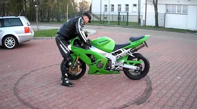 Resulta que nuestro amigo (que parece polaco) quiere impresionar a la persona que está grabando el vídeo, y no se le ocurre otra manera que hacer un Burn-Out con él sujetando la moto por delante. El resultado os lo podéis imaginar. Moto al barranco (Kawasaki ZX-6) y piloto por los suelos con su honor más herido que su propio cuerpo. Menos mal que no acaba dando contra nada ni contra nadie y menos mal que el piloto lleva puesto el mono, las botas y demás (excepto el casco que si no no lo reconocen en su pueblo) Total, nueve segundos de tragedia y más de dos millones de visitas desde que colgaron el vídeo.